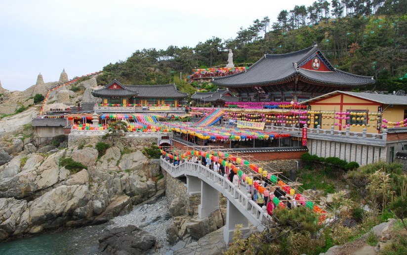 해동용궁사는 바다를 배경으로 한 한국의 독특한 해변 사찰입니다.